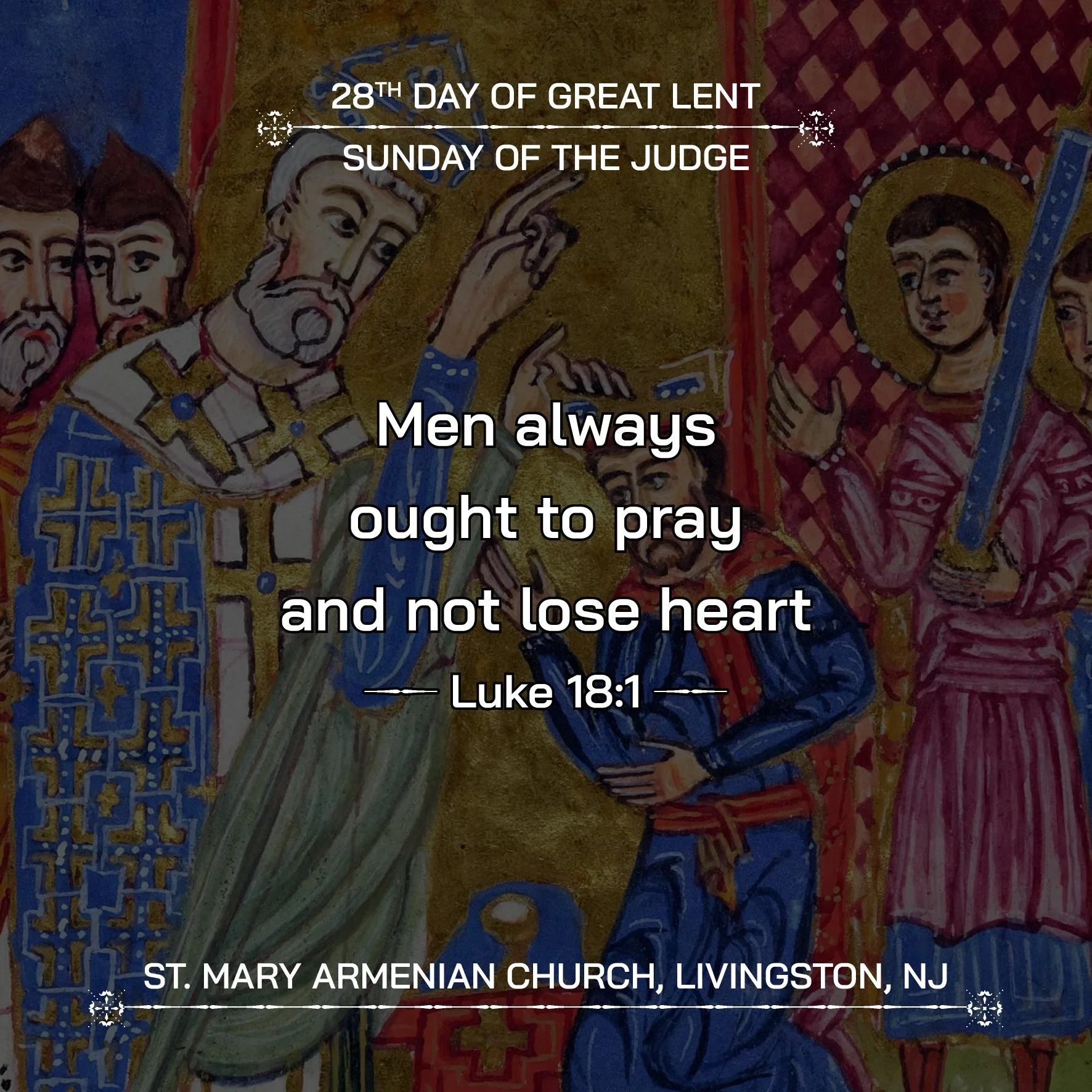 As we approach the final weeks of Great Lent, the Sunday of the Judge calls us to deepen our prayer, renew our faith, and strengthen our hope. Like the persistent widow, we are invited to cling to God without ceasing, trusting not in human justice, but in the perfect righteousness and mercy of our Lord.